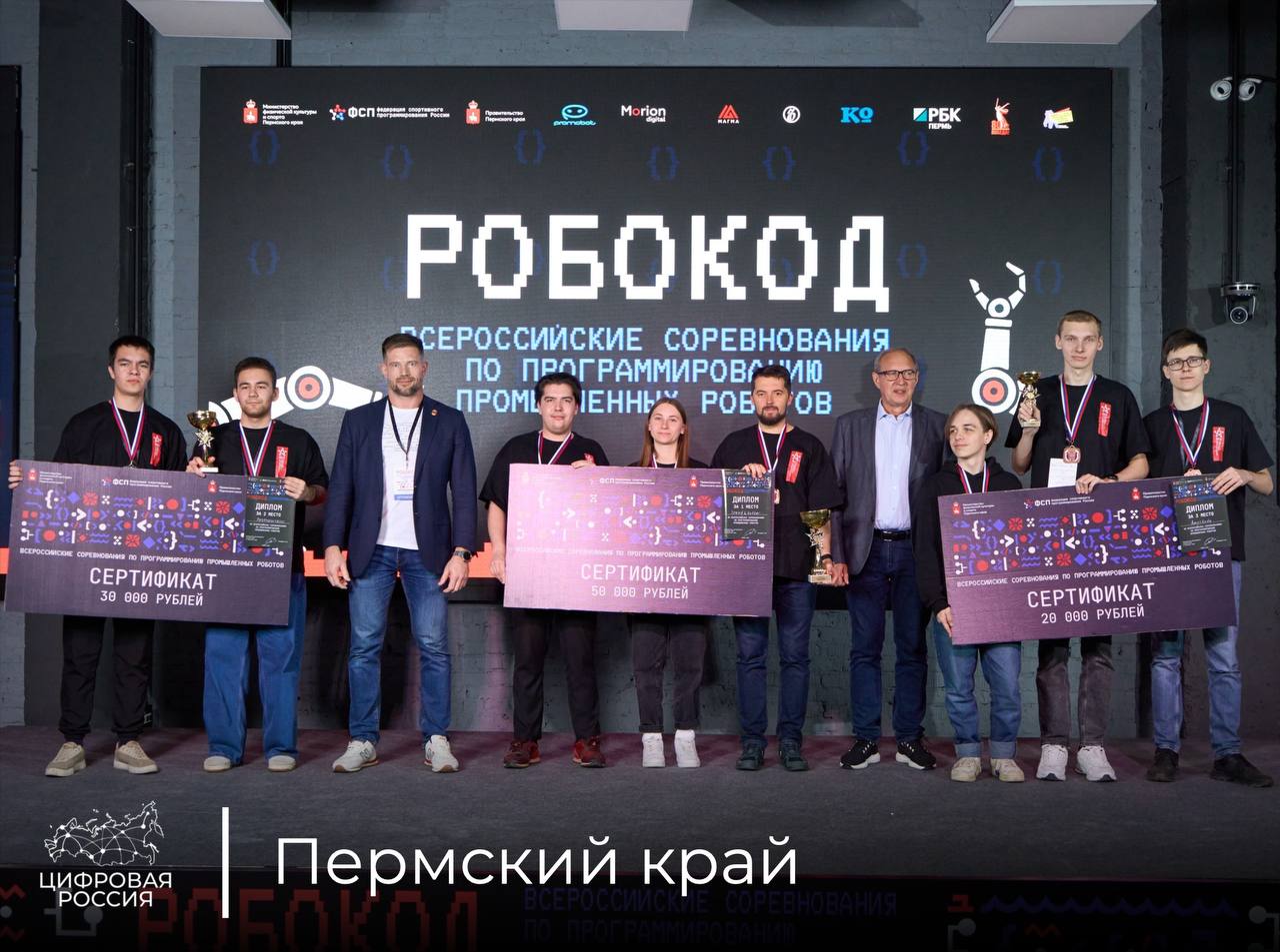 В финале Всероссийских соревнований «РобоКод-2025» команды представили собственные проекты и продемонстрировали навыки программирования промышленных манипуляторов. Победителями взрослого дивизиона стали команды «bread&butter» из Республики Татарстан, «Разрушители» из Пермского края и «Amplituda» из Ульяновской области. В юношеском зачете весь пьедестал заняли команды из Пермского края: «ИБ», «Анимекотики» и «Два таланта». Участники соревнований получили спортивные разряды и разделили призовой фонд — 200 тысяч рублей.